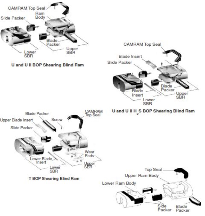 Shear ram is composed of upper ram body ,lower ram body, top seal,right seal, left seal and tool face seal. Tool face seal is placed in th front slot of the upper ram body,with right seal and left seal on the both sides. The shear ram is installed in the BOP in the same manner sa the common ram.but need to replace tha hanger pf the main piston to hunger. otherwise it will not be used.
