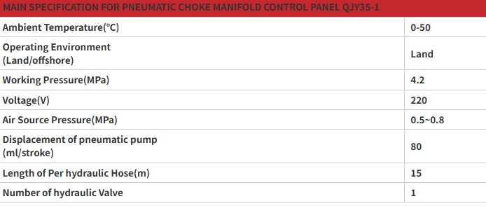 as a control assembly in hydraulic choke manifold, can remote-control the open/close of hydraulic choke valve for a long distance and the control panel can indicate the stand-pipe pressure, casing pressure and the opening/ closing condition of hydraulic choke valve as well as the pulse number and frequency of the mud pump if pump-pulse counter equipped, which can keep the pressure under well and is a necessary device to control kick and blowout and perform the pressure control technology in oil/gas well.
