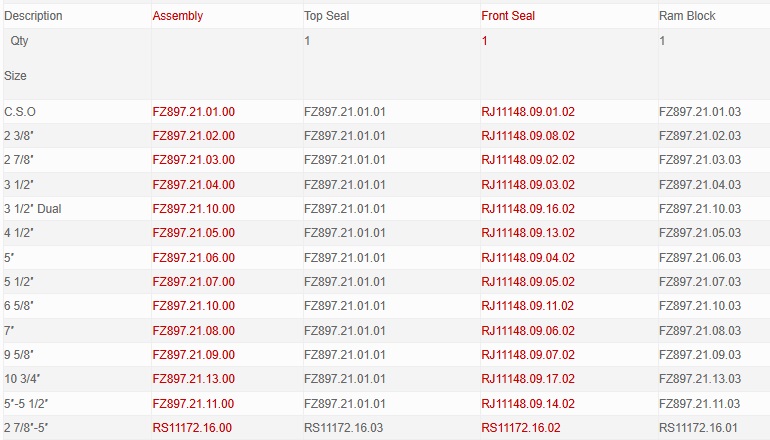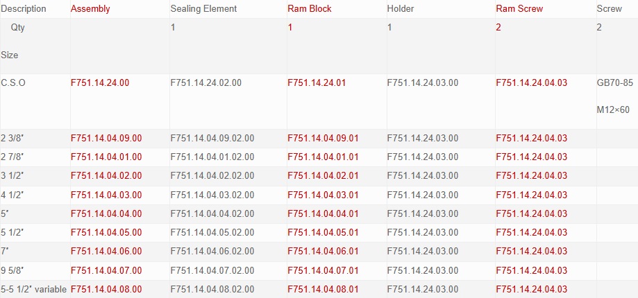 C.S.0., 2 3/8", 2 78",3 112",4",4 1/2",5",5 1/2",6 5/8",7", 9 5/8", 5"~5 12"variable ram, 2 7/8"~5"variable ram,shear ram