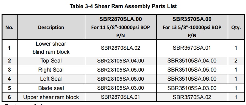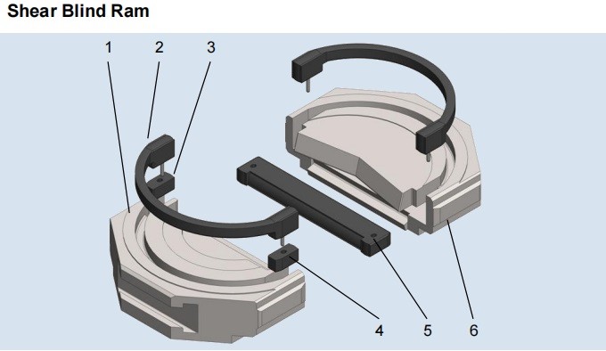 The shear ram consists of the upper and lower ram block, top seal, right seal, left