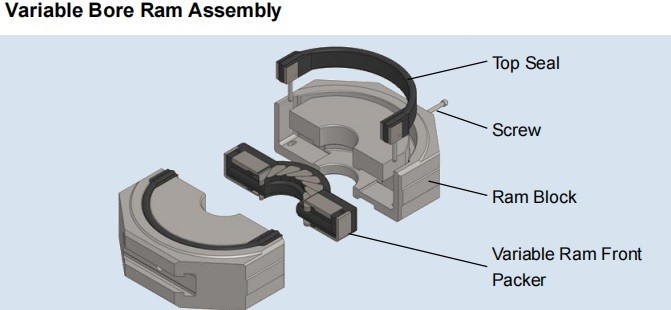 The variable diameter ram is comprised of variable diameter ram block, top seal and the front