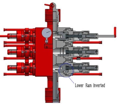 Triple Ram BOPs or Dual Ram BOPs can be configured with the lower set ofRams inverted. This allows the two sets of Rams to trap a cavity full of greasebetween them of higher pressure, preventing escape up or down. This is mandatory in gas wells, since gas will migrate up the cable between the InnerArmor and Outer Armor. By filling the cavity at a pressure higher than wellheadpressure, the grease fills the spaces and prevents escape.