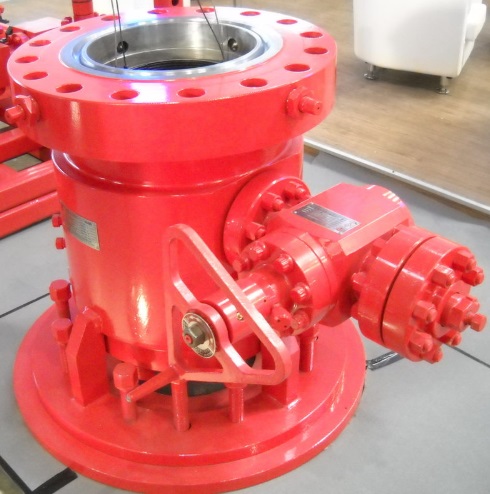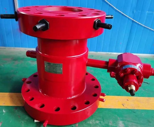 The lower end of casing head spool is connected with the surface casing through threads, and the upper end is connected with the wellhead device or blowout preventer through flanges or clamps. It supports the weight of the subsequent layers of casing through the hanger, bears the weight of the blowout preventer, forms a pressure seal between the inner and outer casing, provides an outlet for releasing the pressure between the casing strings, and can implement the drilling and production process. special work.