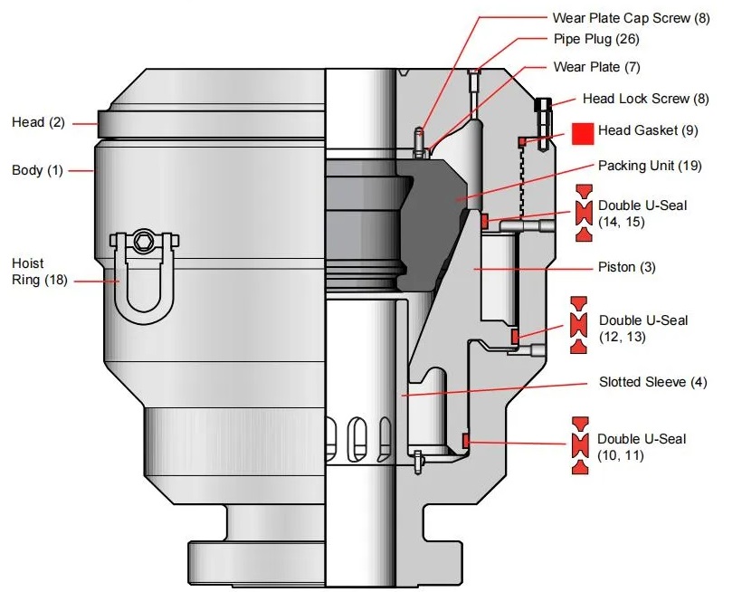 All annular blowout preventer packing units are subjected to wear during closure and stripping. The design of the HYDRIL GK compact blowout preventer ensures closure wear on the outside of the packing unit and stripping wear on the inside, affecting the stripping life of the unit due to routine closures.