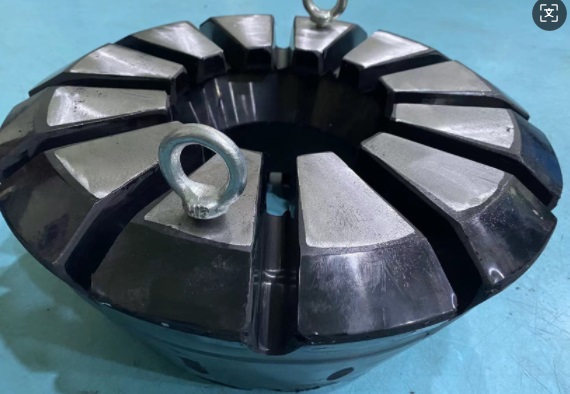 The molded-in steel segments with flanges at the top and bottom anchor the packing unit within the blowout preventer, controlling rubber extrusion and flow when sealing off well pressures. The confined rubber under compression resists tears and abrasion.